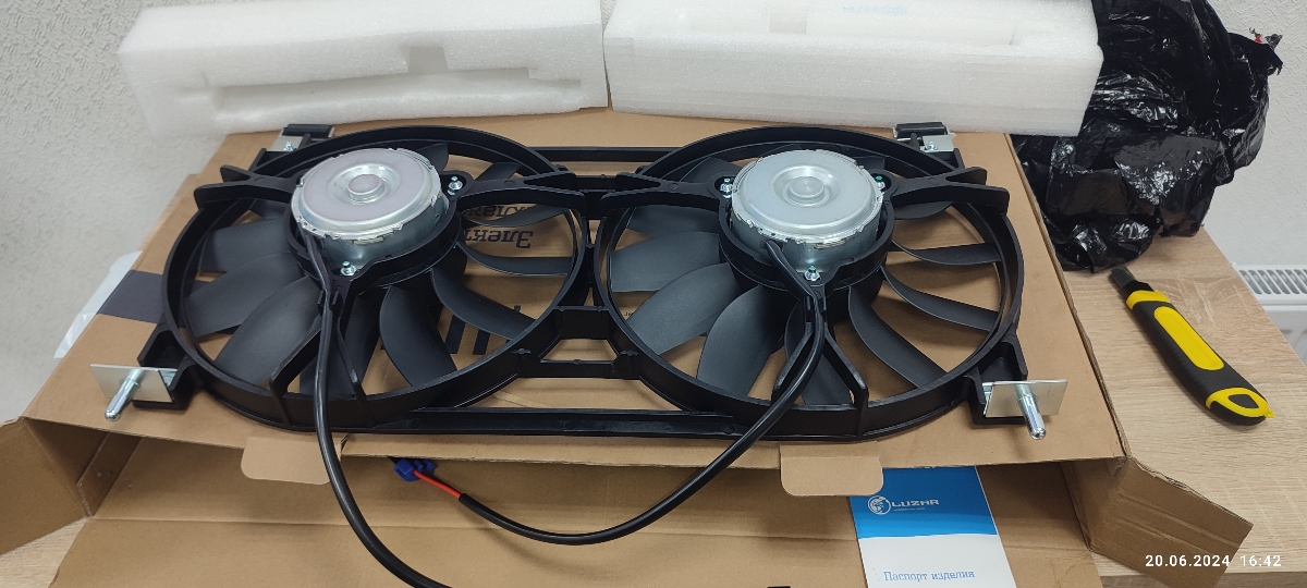 Вентиляторы получил в отличной упаковке с ударогасящими демпферами. Качество изготовления и ЛКП фирменное ?? Перед установкой на машину проверил их от аккумулятора - работают отлично, вращение малошумящие, а это очень важно. Для установки на ВАЗ 2121 потребуется серьезная подгонка.