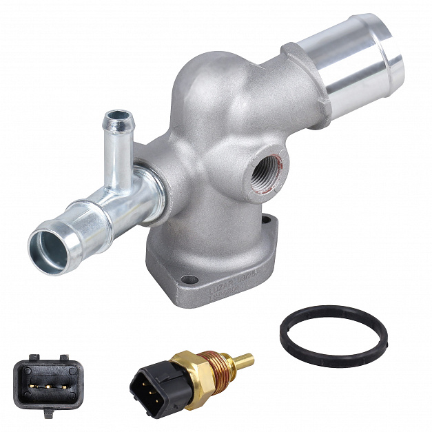 Фланец системы охлаждения для автомобилей Hyundai Solaris (10-)/(17-)/Creta (16-)/Elantra HD (09-)/KIA Rio III (10-)/(17-)/Ceed (18-)/Cerato (18-) (алюминиевый корпус, с датчиком температуры)