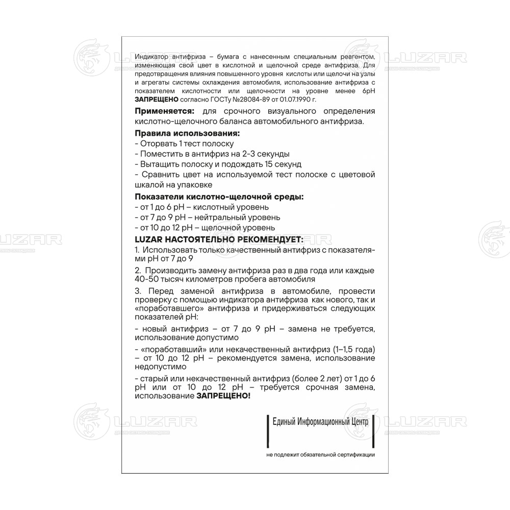 Индикатор антифриза (лакмусовая бумага pH-тест, 10 тестов)
