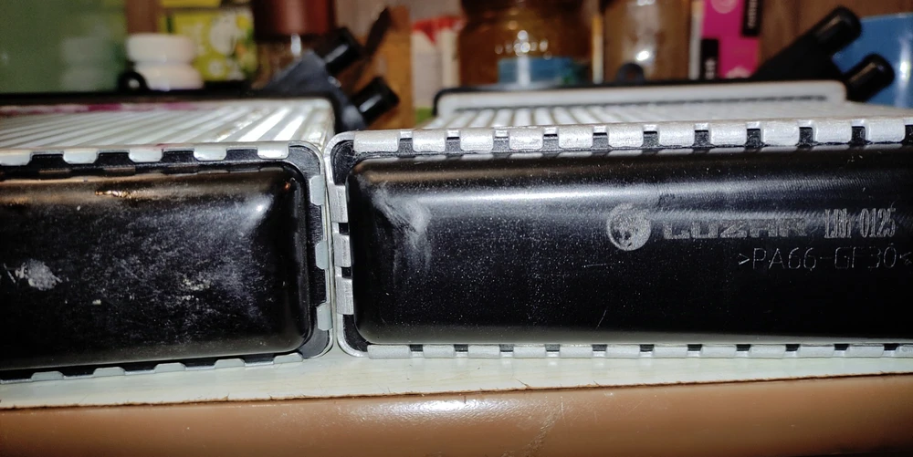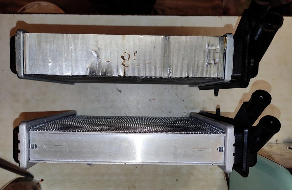 На фото сравнение родного радиатора отопителя (который был установлен на заводе) с радиатором отопителя Luzar. Разницу в размерах хорошо видно. Пытаться устанавливать не стал, так как понял что он просто не влезет. Сразу уточню: нива шевроле 2005 года выпуска и второй радиатор печки именно родной с конвеера и стоял он в корпусе печки очень плотно. Возможно, если снимать полностью торпеду, то тогда как-нибудь радиатор отопителя Luzar может и удастся впихнуть.