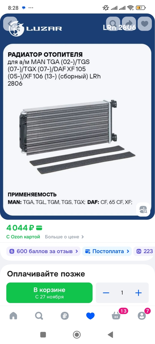 Радиатор отопителя для а/м MAN TGA (02-)/TGS (07-)/TGX (07-)/DAF XF 105 (05-)/XF 106 (13-) (сборный)